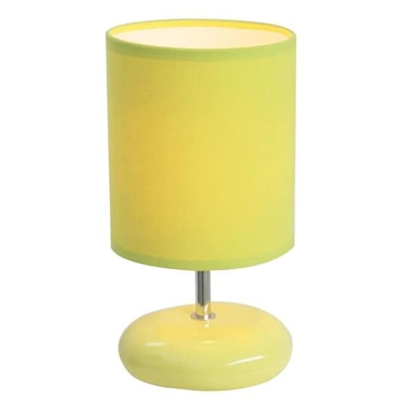 A fun inexpensive and practical table lamp to meet your basic fashion lighting needs. This small lamp features a stone shaped ceramic base and matching fabric shade. The compact size of this lamp makes it the perfect bedside counterpart. Small stone shaped ceramic base Matching fabric shade Perfect for bedroom kids room or college dorm Uses 1 x 40W type B E12 Candelabra Base bulb (not included) Height: 10.5" Shade diameter: 5.5"