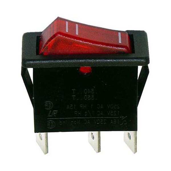 Lighted Rocker , 1" X 1/2", 12A/250V, T-125,; 110V Lamp, Black Body With Red Lighted Rocker With 3 Lines,;3 Ea 1/4" Tabs;Star Toaster St02, St04