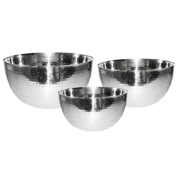 Hammered finish Serving Bowl Set. This hand hammer stainless steel bowl is as functional as it is beautiful. Their simple, Contemporary styling makes them both practical and beautify -a-suitable fit for any table setting or occasion Capacity 1 qt, 2 qt and 4qt nests together for easy storage dishwasher safe easy to clean.