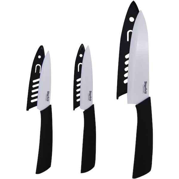 Did you know that ceramic blades are very sharp and retain their sharpness up to 10 times longer than steel blades? Try this 3 Piece Set of Ceramic Knives from Starfrit and you'll be hooked! Each ceramic knife is ergonomically designed and a joy to use.