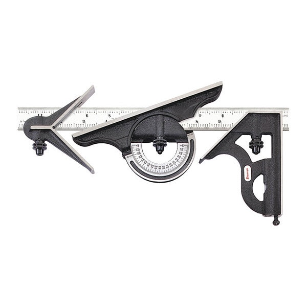 Combination Set, Number of Pieces 4, Blade Finish Brushed, Blade Material Steel, Head Length 2 1/4 in, Head Width 7/16 in, Blade Length 12 in, Blade Thickness 0.06 in, Blade Width 5/8 in, Graduation Mark Style Etched, Graduation Marks - Front 1/100 in (Aircraft Quick Reading ), 1/64 in (Quick Reading), Head Type Center/Reversible Protractor/Square, System of Measurement SAE, Head Material Cast Iron, Head Vial Included No, Accuracy +/- .0025 in, Features Reversible Lock Bolt