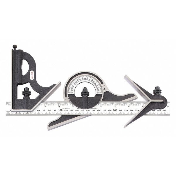 Combination Set, Number of Pieces 4, Blade Finish Brushed, Blade Material Steel, Head Length 4 1/2 in, Head Width 3/4 in, Blade Length 11 3/4 in, Blade Thickness 0.09 in, Blade Width 1 in, Graduation Mark Style Etched, Graduation Marks - Front 1/2 mm, 1/32 in, Graduation Marks - Back 1/64 in, Head Type Center/Non-Reversible Protractor/Square, System of Measurement Metric/SAE, Head Material Cast Iron, Includes Blade, Non-Reversible Protractor Head, Head Vial Included Yes, Accuracy +/- .0025 in