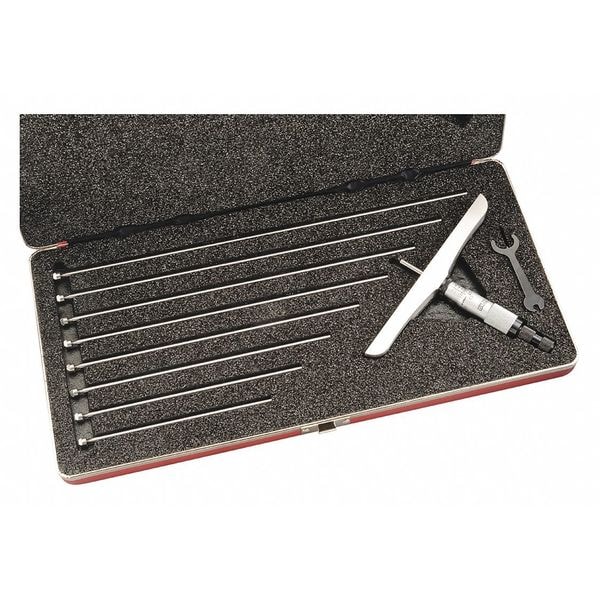 Mechanical Depth Micrometer, Range 0 in to 9 in, Resolution 0.001 in, Accuracy +/-0.0001 in, Long Form Calibration Certificate No, Base Length 6 in, Base Style Full, Dimension Type Inch, Included Certification No, Mechanical Display Type None, Number of Measuring Rods 9, Operation Type Mechanical, Resolution - Counter Not Applicable, Rod Diameter 5/32 in, Anvil Shape Round, Case Included Yes, Case Type Padded Case