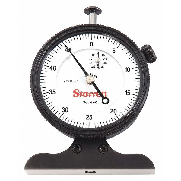 Dial Depth Gauge, Range 0 in to 0.5 in, Graduations 0.0005 in, Accuracy 0.001 in, Long Form Calibration Certificate No, Base Length 2.5 in, Base Style Full, Dial Position Side, Dimension Type Inch, Included Certification No, Number of Measuring Rods 1, Operation Type Mechanical, Range per Revolution 0.05 in, Case Included Yes, Contact Point Shape Curved, Depth Gauge Type Solid-Plunger Depth Gauge, Dial Color White, Dial Reading 0-50, Lock Nut Type Thumb Screw, Maximum Measurement - Inch 0.5 in
