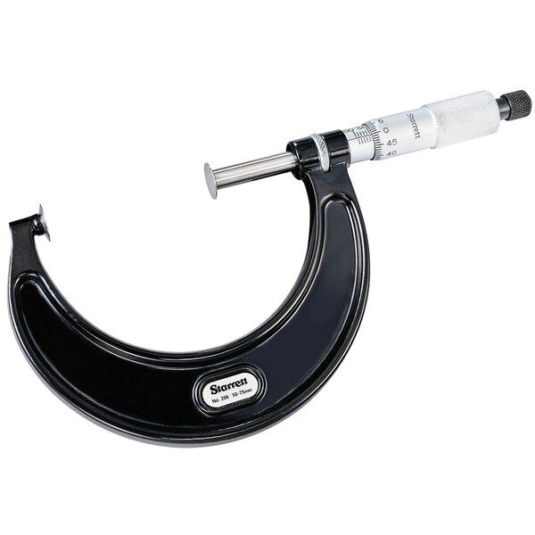 The Starrett 256M Disc-Type Micrometer is used to measure the thickness of work sections such as ribs, lands, fins, cutting edges on form tools, and chordal thickness of gear teeth. Because of their large anvil and spindle faces, the 1" and 25mm sizes are also useful for measuring the thickness of sheet materials like paper, cardboard, rubber, and plastics. 0-75mm Range, 0.01mm Grad, Ratchet Stop, Lock Nut.