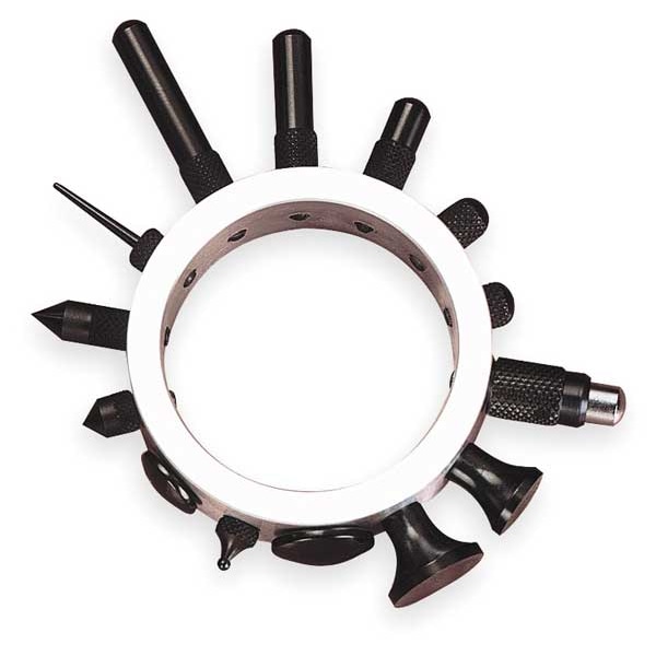 14 points with #4-48 screw thread to fit AGD indicators; a regular 1/4 in (6.3 mm) long point; 9 special form points; 28 shock absorbing anvil; 3 extra long points 1/2 in, 3/4 in and 1 in (13 mm, 19 mm, 25 mm) long