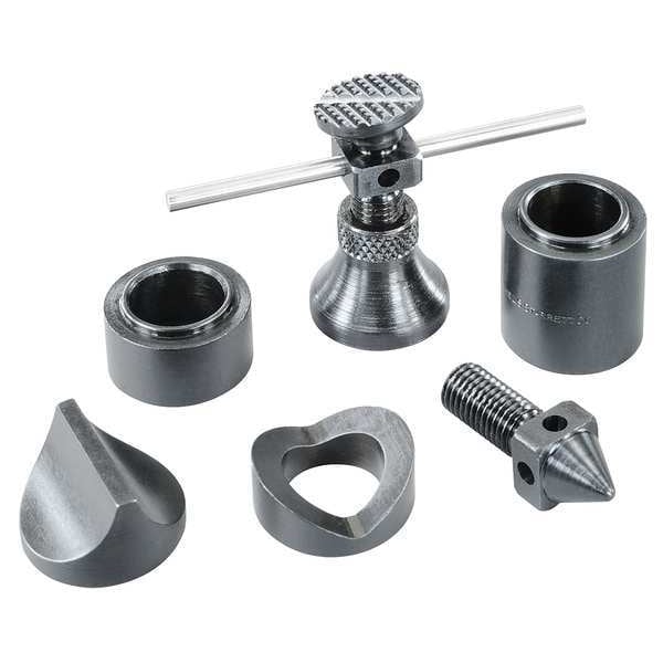 6 Pieces: 20-Pitch Jack Screw 1-1/2 to 2-1/4 in Range, Extension Base 1/2 in and 1 in , Auxiliary Pointed Screw, Extension Base for Non-Flat Surface, Extension V Base for Cylindrical Forms