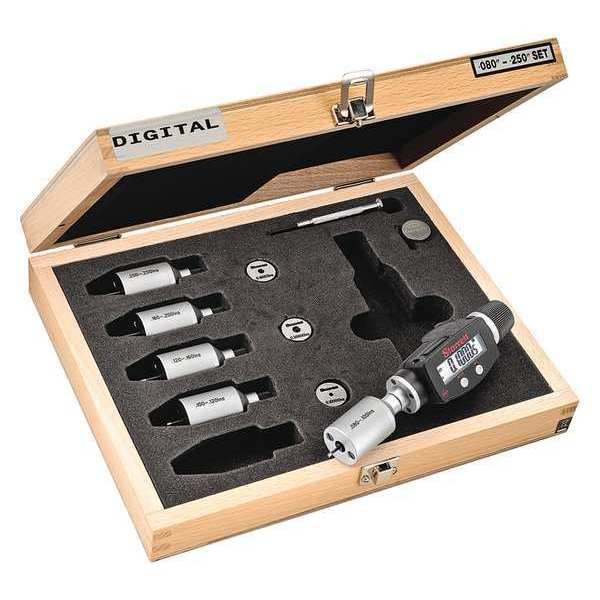 Digital 3-Point Inside Micrometer Set, Range 0.08 in to 0.25 in, 2 mm to 6 mm, Resolution 0.00005 in, 0.001 mm, IP Rating IP65, SPC Output Yes, Data Output Type Cabled, Wireless, Movement of Screw 1 in, Coolant Resistant Yes, Inside Micrometer Type 2-Point Inside Micrometer, Number of Measuring Rods 0, Number of Micrometers 1, Operation Type Digital, Thimble Type Ratchet, Case Included Yes, Case Type Wood Case, Contact Point Material Carbide, Display Type LCD