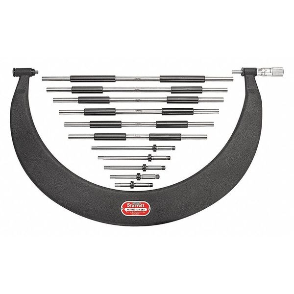Mechanical Interchangeable-Anvil Outside Micrometer, Range 12 in to 18 in, Resolution 0.001 in, Accuracy +/-0.0003 in, SPC Output No, Anvil Shape Flat, Dimension Type Inch, Operation Type Mechanical, Thimble Type Plain, Anvil Material Steel, Case Included Yes, Case Type Wooden, Features Interchangeable Anvils, Includes Wood Case, Lock Nut Type Ring, Maximum Measurement - Inch 18 in, Minimum Measurement - Inch 12 in, Spindle Material Steel