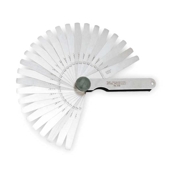 Tapered Feeler Gauge Set, Finish Uncoated, Blade Length 3 1/32 in, Blade Material Steel, Blade Style Tapered Blade, Dimension Type Inch, Included Certification Not Applicable, Maximum Thickness - Inch 0.025 in, Minimum Thickness - Inch 0.0015 in, Non-Marring No, Number of Feeler Blades 26, Thickness Range 0.0015 in to 0.025 in, Tolerance +/-0.00025 in