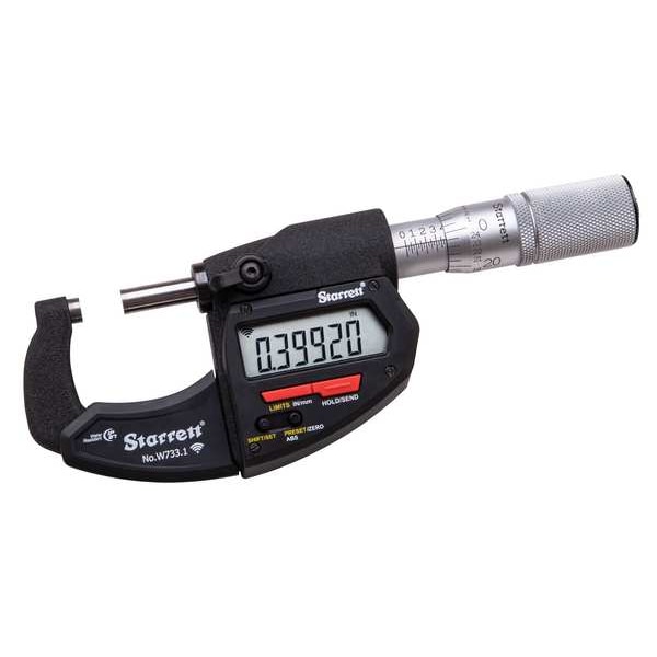 Wireless Digital Micrometer, Range 0 in to 1 in, 0 mm to 25 mm, Resolution 0.00005 in/0.001 mm, Accuracy +/- 0.00015 in, +/- 0.004 mm, IP Rating IP67, SPC Output No, Data Output Type Wireless, Long Form Calibration Certificate No, Coolant Resistant Yes, Dimension Type Inch/Metric, Included Certification Certificate of Inspection, Jaw Depth Not Applicable, Operation Type Digital, Thimble Type Friction, Anvil Material Carbide, Anvil Shape Flat Carbide Tipped, Case Included Yes, Display Type LCD