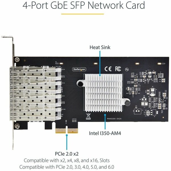 4-Port GbE SFP Network Card, PCIe 2.0 x2 x4, x8, x16 Compatible, Intel I350-AM4 4x GbE Controller, 1000BASE Copper/Fiber Optic, Gigabit Ethernet NIC