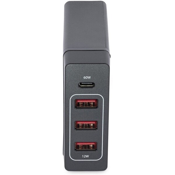 1 Port USB-C Desktop Charger with 60W Power Delivery - 3 USB Ports, (1) Power Cord (NA), (1) Quick Start Guide