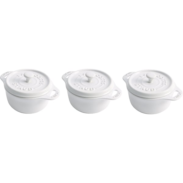 The elegance and functionality of Staub ceramics goes from freezer to oven to table. The glass porcelain finish matches Staub's cast iron to mix perfectly on your table top. Oven and broiler safe up to 572F, ceramics can also be used in the microwave and are dishwasher safe. Highly scratch, impact, and thermal shock resistant. The Staub Ceramic 3-pc Mini Cocotte Set is a veratile addition to any kitchen. Store salt and pepper on the counter for quick access, bake up individual deserts, or serve your favorite mac & cheese recipe. Vitreous glass porcelain-enamel finish. Beautiful finish is highly scratch resistant. Stoneware will not absorb moisture, diffuses heat gently and retains heat exceptionally well. Transitions from oven to table beautifully. Microwave, freezer, broiler, and oven safe up to 572F. Dishwasher safe. Desiged by Staub in France, manufactured in China.