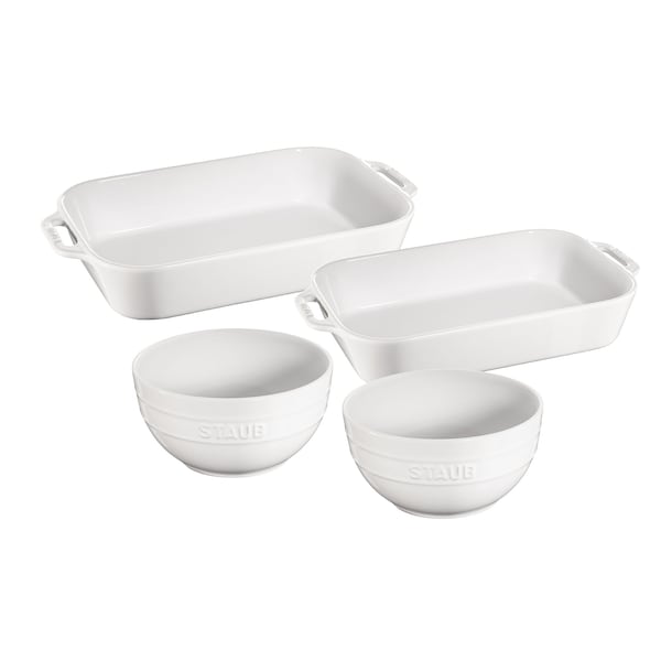 The STAUB Baking and Bowl Set is a stylish and practical addition to any working kitchen. The set consists of two nesting baking dishes and 2 stackable large universal bowls.STAUB rectangular stoneware bakers gently retain heat and won't absorb moisture, producing a delicious result for all of your favorite recipes. Both dishes are ideal for lasagna, casseroles, and desserts, as well as roasted meats and vegetables, and they transition beautifully from oven to table. The ceramic bowls are perfectly designed for cereal and soup and can be used to store prep ingredients or serve sides at the table.The elegance and functionality of STAUB ceramics goes from freezer to oven to table. The glass porcelain finish matches all STAUB cast iron to mix perfectly at the table. Oven and broiler safe up to 572 DegF, ceramics can also be used in the microwave and are dishwasher safe, as well as highly scratch, impact, and thermal shock resistant. Set includes 7.5-in. x 6-in. and 10.5-in. x 7.5-in. rectangular baking dishes and 2 6.5-in. universal bowls. Vitreous glass porcelain-enamel finish. Beautiful finish is highly scratch resistant. Stoneware will not absorb moisture, diffuses heat gently and retains heat exceptionally well. Microwave, freezer, broiler, and oven safe up to 572 DegF. Transitions from oven to table beautifully. Designed in France. Dishwasher safe.