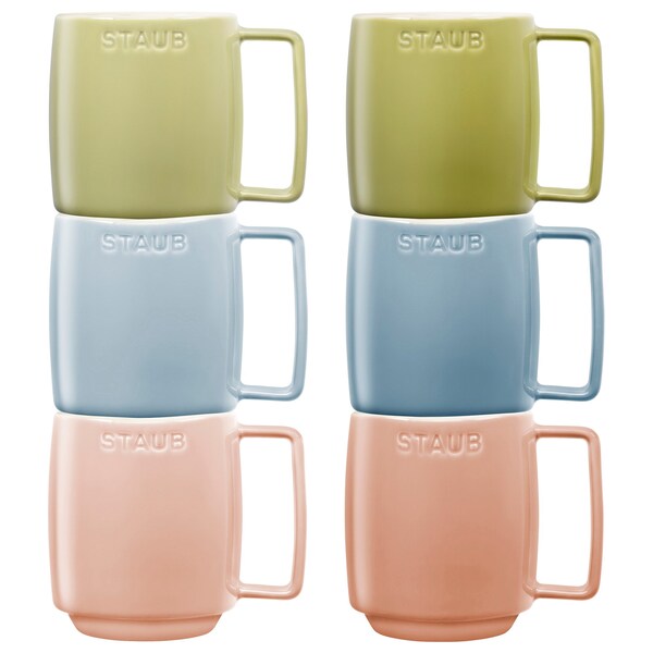 They say you can’t please everyone, but you can certainly try with this set of ceramic mugs in six pastel shades. Let your family or guests chose their favorite color as well as their favorite hot drink: French coffee, strong tea with milk, creamy cappuccino, fragrant herbal tea or hot chocolate - the possibilities are endless.Good thing that the ceramic mugs are robust and easy to clean: just put them in the dishwasher and be ready for the next break. And if you really don’t need them for a while, you can stack them for storage. The matching shades in light and dark pink, green and blue even let you create a harmonious display in your cupboard, or when you use their ergonomic handles to hang them from a cup rack. Set of six mugs in pastel colors. High-quality ceramic. 12 fl oz. Ergonomic handle. Temperature-resistant up to 572 DegF. Microwave and dishwasher safe.