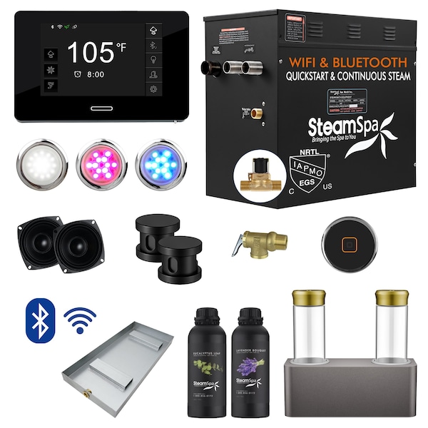 - •Package includes: QuickStart 12kW Steam Bath Generator, WIFI reciever box, BLUETOOTH control panel, two Matte Black steamheads, pressure relief valve, dual steam bath speakers, white LED light, two chromatherapy color lights, drain pan, and 2 FREE aromatherapy scented oil bottles (Eucalyptus Leaf and Lavender Bouquet)