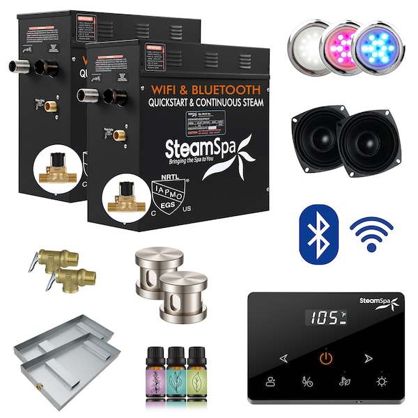 - INCLUDED: 2x 10.5 KW Steam Bath Generator, Advanced Touch Screen Pad, BLUETOOTH and WIFI Controls, 4x Round Brushed Nickel Steamheads, Outer Button, HQ Stereo Speakers, 2x Chroma Lights, LED White Light, Dual Aroma Pump with 2x XL Aroma Bottles, 2x Drain Pan, PR-Safety Valves