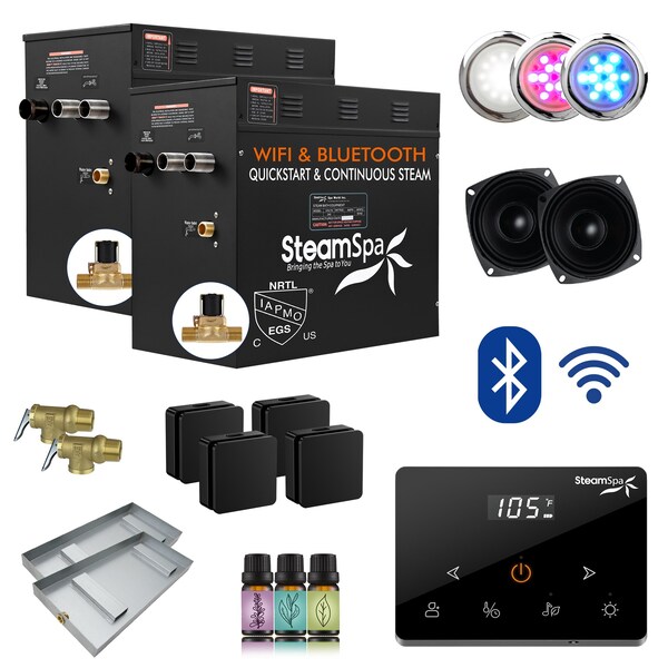 - INCLUDED: 12 KW Steam Bath Generator, Advanced Touch Screen Pad, BLUETOOTH and WIFI Controls, 2x Square Chrome Steamheads, Built-in Auto-Drain, Outer Button, HQ Stereo Speakers, 2x Chroma Lights, LED White Light, Drain Pan, PR-Safety Valve, and Free Aroma Bottles