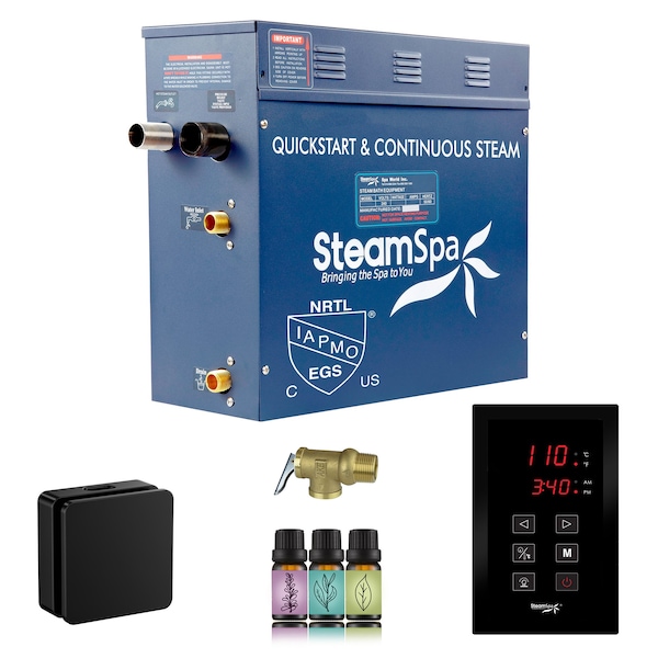 - Package Includes: One 4.5 KW Steam Bath Generator, Single Touch Control, One Square Matte Black Steamhead, One Pressure Relief Valve, and Three 10ml Aroma Gift Bottles
