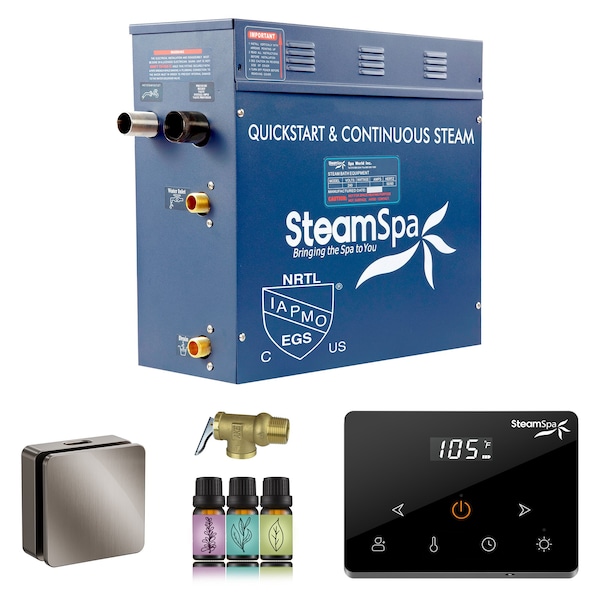 - Package Includes: One 6 KW Steam Bath Generator, Standard Wireless Control Pad, One Square Brushed Nickel Steamhead, One Pressure Relief Valve, and Three 10ml Aroma Gift Bottles
