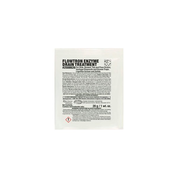 STEARNS FLOWTRON ENZYME DRAIN TREATMENT - 1 OZ PACKS, 72 PACKS/CASE - 2508626 AN EFFECTIVE POWDER ENZYME TREATMENT FOR MAINTAINING OR UNCLOGGING DRAINS AND GREASE TRAPS. NON-TOXIC, NON-CAUSTIC, AND NON-ACID. DISSOLVES EVERY FORM OF CONCEALED WASTE MATTER, AND ALLOWS NATURE TO PURIFY THE ENTIRE DRAIN SYSTEM. ONE PACK PER DRAIN.