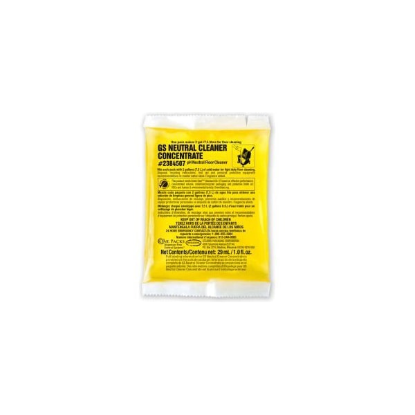 STEARNS GS NEUTRAL CLEANER CONCENTRATE - 1 OZ PACKS, 144 PACKS/CASE - 2384507 CONCENTRATED PH-NEUTRAL FLOOR CLEANER THAT CONTAINS NO CAUSTIC, ABRASIVE, OR HARSH INGREDIENTS TO MAR FINE FLOOR FINISHES. FRESH CLEAN FRAGRANCE. OPTIMUM CLEANING WITH NO ALKYL OR NONYL PHENOLS. EACH PACK MAKES 2 GALLONS.