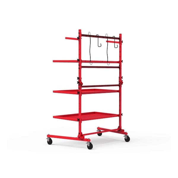 Versatile parts cart with patents pending, unique folding mast to allow dual side parts access; via simple hand-twist fasteners allows each shop to configure shelves and place components as needed. Wide 4 polyurethane casters attached to telescopic legs (29.7 to 45.7) allow the cart to easily support up to 396 lbs. loads from either side.