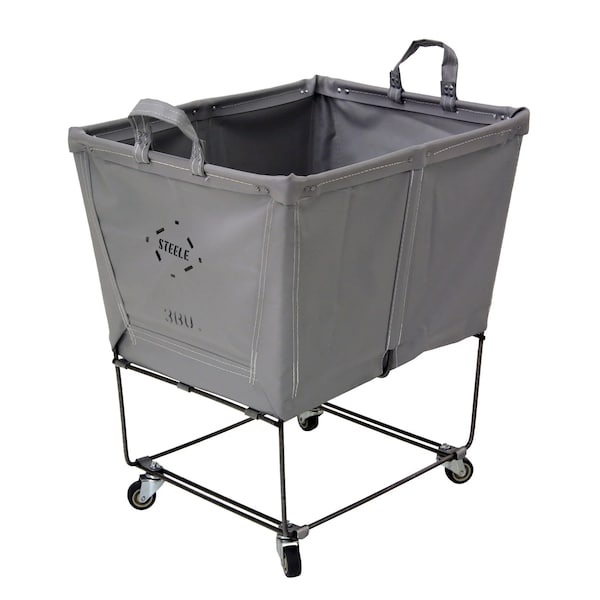 Our 2 BU grey vinyl permanent style elevated truck is built with 3/8in recycled steel in an ergonomic design to prevent excessive bending when loading and unloading items. Rolling on 4 All Swivel 2in industrial non-marking stem casters, featuring a rubber hard card and thermal plastic wheel that provides a soft and quiet ride. Each caster is graded for 75 lbs, giving this truck a weight capacity of 300 lbs. The body, which is sewn around the rim, is made with our proprietary Steeletex, which is an 18.5 oz. tear and water-resistant vinyl coated nylon, treated with BAC Shield to prevent the growth of mold, mildew and other harmful bacteria. The BAC Shield formula also encompasses UV protective properties which increases superior outdoor life by lowering UV degradation. Steeletex is BPA Free, Prop 65 and CPSIA Compliant. A galvanized, flat steel grid, spot welded bottom is added to provide superior strength. Its compact size is great for moving small loads short distances, making them ideal for garment factories, dry cleaners or home laundry rooms. A 42 oz. antimicrobial vinyl with a 1,000 denier nylon backing is wrapped around the 3/8in steel rim. Canvas handles at both ends are riveted around the rim to provide maximum strength.