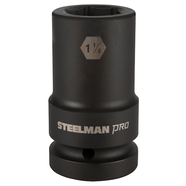 Every mechanic knows that having a reliable set of tools can make your life easier when working on heavy-duty vehicles and equipment. The STEELMAN PRO 79340 1-Inch Drive 6-Point 1-1/8-Inch Thin Wall Deep Impact Socket is ideal for use in performing maintenance, repairs and service on large trucks and tractor trailers, farming equipment and tractors, oilfield and construction equipment, and mass transit vehicles. Made from drop forged and heat treated chromoly steel, this socket features a ball detent recess on the 1-inch drive end to help hold it securely onto ratchets, air wrenches, adapters, and extensions. The 6-point shape grips the sides of fasteners and not the corners, reducing wear and the chance of rounding the fastener and the thin walled, deep well design allows easy reach of nuts on extended threads and recessed bolts even when they are in tight areas, too narrow for regular sockets. The socket features a rust and corrosion resistant black phosphate protective coating with laser etched size callouts and markings. Rated to withstand up to 150% of ASME torque requirements for impact tools, this socket can handle tough use in any professional shop / garage, home workshop, or on the work site.