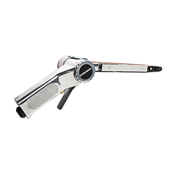 The STEELMAN 1612 is an ideal tool for auto repair work, weld prep and cleanup, sharp edge grinding and removal, and more. With a maximum free run speed of 16,000 RPM this pneumatic tool uses a 1/2-inch x 24-inch (13mm x 610mm) 120 grit belt to will help you get the job done right and done fast. With a 360-degree rotatable head and extra long reach you can easily work in areas other pneumatic sanders can't reach. The built-in regulator allows for constistant performance and the tool operates on 14.2 cubic feet per minute of 90 PSI compressed air. Exhaust is redirected back out through the handle away from your work area. Threaded to accept a conventional 1/4-inch NPT air inlet to connect it to a 3/8-inch air hose this tool is 24.5-inches long overall and weighs 2.55 lb. Includes one 120 grit sanding belt.