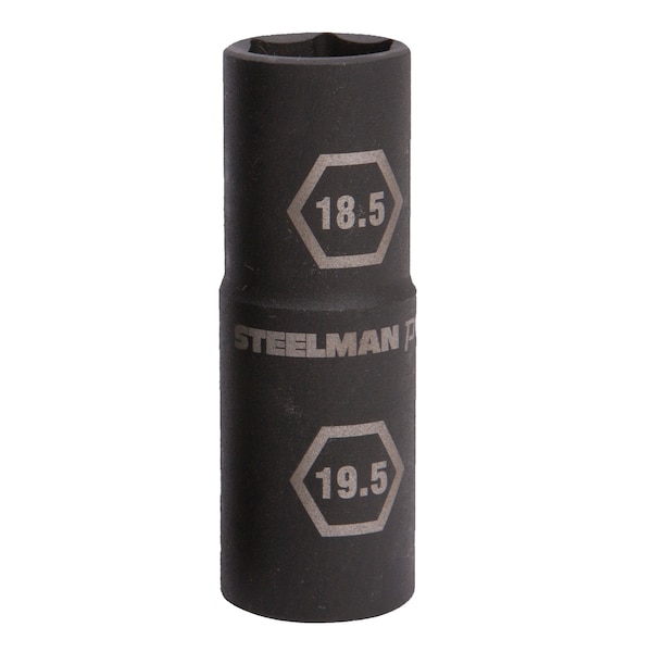 The STEELMAN 97025 1/2-Inch Drive 18.5mm x 19.5mm Impact Flip Socket was designed to save you time by maximizing efficiency. This dual-ended, 6-point metric impact grade flip socket allows you to work on both 18.5mm and 19.5mm lug nuts and fasteners without having to constantly switch sockets. Made of durable and hardened chromoly steel which is then given a black oxide protective coating, this socket is designed to meet or exceed 150% proof of torque under ASME tool performance testing standards. Fitting easily over an impact extension or onto an impact wrench's extended anvil, this socket's recessed edges provide the most accurate fit possible, gripping fasteners by the sides and not the edges which results in reduced slippage and rounding/fastener damage. Laser-etched size callouts make identification among other sockets easy. Whether you’re a professional mechanic at a repair or tire shop, or just love to work on your own cars and vehicles, this flip impact socket is a must for working efficiently!