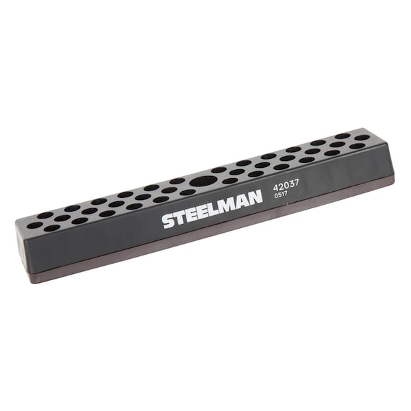 Keep all your 1/4-inch hex bits organized with the STEELMAN 42037 magnetic organizer. The soft rubberized covering on the bottom of this organizer prevents damage to finished surfaces and does double duty by both allowing the holder to be mounted on any ferrous metal surface and keeping held sockets securely in place. The organizer is designed to securely hold a total of 36 hex bits and in a central bonus holder a single 1/4-inch drive socket. The durable plastic construction is oil and fuel resistant and the smooth surface is easy to wipe clean when soiled. In addition, the magnetic material used is non-transferrable and will not magnetize held sockets or surfaces/tools it comes in contact with.