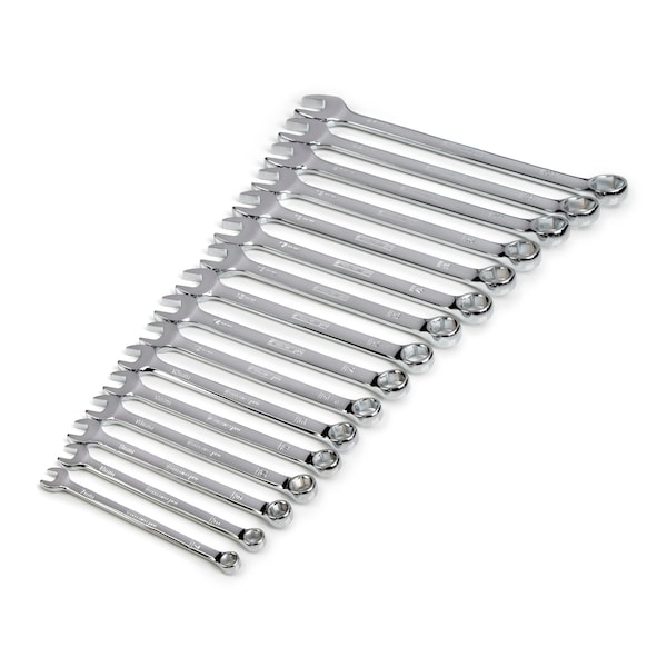 Work with the same quality tools as service technicians with the STEELMAN PRO 78331 . Constructed of heat treated chrome vanadium steel alloy these tools are guaranteed to meet or exceed ASME and ANSI torque standards to give you the long lasting durability you require from your tools. Size callouts are stamped into the steel both vertically and horizontally on both sides of each wrench to make identification easy. A mirror-polish chrome plating covers each wrench providing rust and corrosion resistance that is easily wiped clean when soiled. Open ends on these combo wrenches are angled 15-degrees to provide increased leverage and easier access to fasteners in tight places. Similarly, the box end has a 15-degree offset to provide your fingers with that little bit of extra clearance that they need as you work. Set includes the following metric sizes: 7mm, 8mm, 9mm, 10mm, 11mm, 12mm, 13mm, 14mm, 15mm, 16mm, 17mm, 18mm, 19mm, 21mm, 22mm, and 24mm. When the job is done the wrenches can be stored in the included ABS plastic storage rack that can either lay flat inside a toolbox drawer or be hung on a wall using the folding carrying handle.