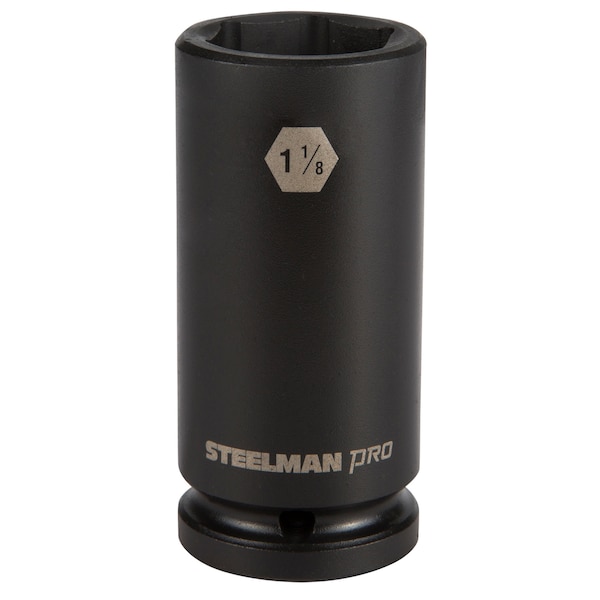Every mechanic knows that having a reliable set of tools can make your life easier when working on heavy-duty vehicles and equipment. The STEELMAN PRO 79267 3/4-Inch Drive 6-Point Deep Impact 1-1/8-Inch Socket is ideal for use in performing maintenance, repairs and service on large trucks and tractor trailers, farming equipment and tractors, oilfield and construction equipment, and mass transit vehicles. Made from drop forged and heat treated chromoly steel, this socket features a ball detent recess on the 3/4-inch drive end to help hold it securely onto ratchets, air wrenches, adapters, and extensions. The 6-point shape grips the sides of fasteners and not the corners, reducing wear and the chance of rounding the fastener and the deep well design allows easy reach of nuts on extended threads and recessed bolts. The socket features a rust and corrosion resistant black phosphate protective coating with laser etched size callouts and markings. Rated to withstand up to 150% of ASME torque requirements for impact tools, this socket can handle tough use in any professional shop / garage, home workshop, or on the work site.