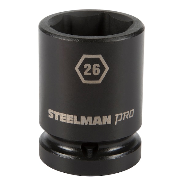 Every mechanic knows that having a reliable set of tools can make your life easier when working on heavy-duty vehicles and equipment. The STEELMAN PRO 79274 3/4-Inch Drive 6-Point 26mm Impact Socket is ideal for use in performing maintenance, repairs and service on large trucks and tractor trailers, farming equipment and tractors, oilfield and construction equipment, and mass transit vehicles. Made from drop forged and heat treated chromoly steel, these sockets feature a ball detent recess on the 3/4-inch drive end to help hold it securely onto ratchets, air wrenches, adapters, and extensions. The 6-point design grips the sides of fasteners and not the corners, reducing wear and the chance of rounding the fastener. The socket features a rust and corrosion resistant black phosphate protective coating with laser etched size callouts and markings. Rated to withstand up to 150% of ASME torque requirements for impact tools, this socket can handle tough use in any professional shop / garage, home workshop, or on the work site.