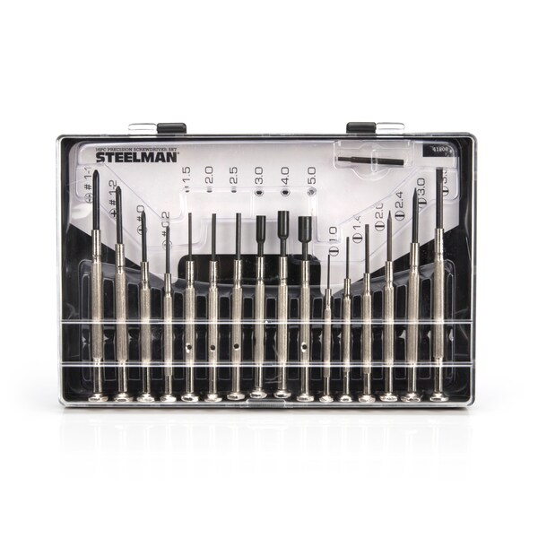 The STEELMAN 41800 Precision Steel Shaft Screwdriver Set provides you with four different types of screwdrivers in various sizes to help with any repair job. The shafts are constructed of hardened carbon steel, ensuring the tips won't chip or round out with repeated use. Free-spinning, swivel caps allow for constant pressure during fastener installation and removal, and the knurled shafts prevent your fingers from slipping. To help remove stubborn hex drive fasteners and nuts the 6 hex and nut drivers have a hole in the shaft to which an included rod can be inserted to give you extra leverage and more torque. This 16-piece set includes 4 Phillips head drivers in size PH2, PH1, PH02, and PH00; 6 flat/slotted head drivers in size 1.0mm, 1.4mm, 2.0mm, 2.4mm, 3.0mm, and 3.8mm; 3 Hex head drivers in size 1.5mm, 2.0mm, and 2.5mm; and 3 nut drivers in size 3.0mm, 4.0mm, and 5.0mm. To keep all these tools organized they come in a convenient black and clear plastic storage case. The variety of tip sizes are ideal for working on eyeglasses, watches, electric guitars and other instruments, rc drones and vehicles, laptop and desktop computers, mobile phones, and other small electronics.