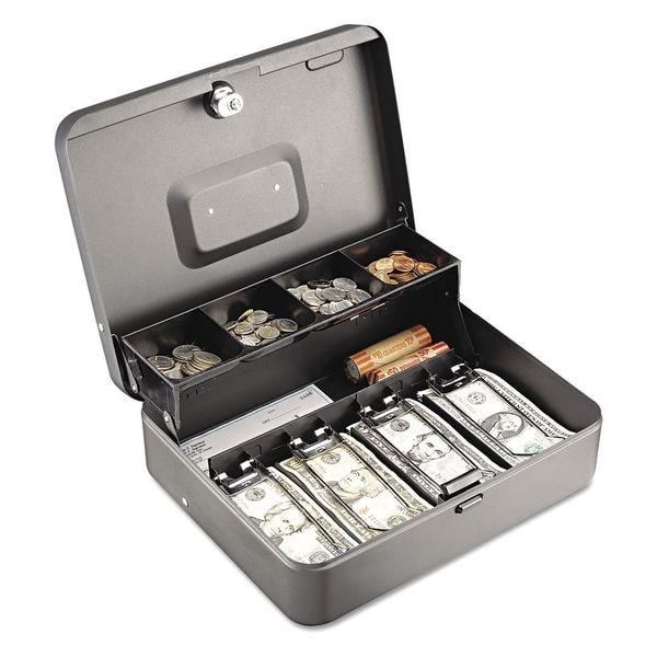Cash Box, Number of Compartments 10, Material Steel, Lock Style Cam Key Lock, Color Gray, Height 3 3/16 in, Width 11 13/16 in, Depth 9 7/16 in, Includes (2) Keys and a Tray