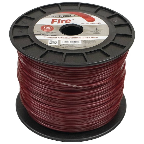 Silver Streak Fire Trimmer Line features a round shape and is highly durable when contacting concrete, landscape rocks and trees. This general-purpose line is a good choice for a variety of trimming jobs around the yard because of its versatility. To enhance its strength, the line is made from a copolymer formula that blends two different materials. Copolymer line is more resistant to stretch and breakage. Round trimmer line is meant for multi-use trimming applications around the yard. The round profile exerts less drag on the motor of the trimmer and wears down less quickly than other shapes of trimmer line. It also tends to be easier to load in the trimmer and breaks off less frequently. Fire Trimmer Line comes in an intense red color that stands out in the lawn, making it easy to spot pieces that break away.