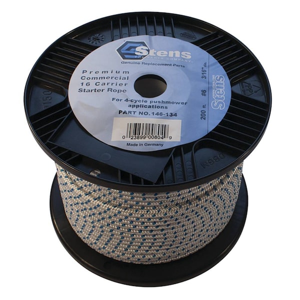 Stens True Blue Starter Rope is a premium grade product that makes starting outdoor power equipment easier. True Blue is made from a polyester full synthetic fiber featuring 16 strand braid construction with core line and an outer coating. Its 16-carrier sheath provides rope longevity with more yarn to wear before reaching the polyester core. This starter rope is made to withstand the frequency and pulling force commonly experienced by starter rope in commercial operations. High tensile strength resists breakage and damage that can shorten the serviceability of lower grade starter ropes. Low stretch properties keep the rope in shape over a long service life. High wear resistance reduces premature wearing at contact points. A smooth surface with a soft and flexible texture enhance easier pulling and starting of engines. Stens True Blue Starter rope is a preferred choice for commercial operators whose work is more demanding on equipment.
