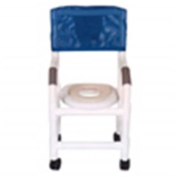 16" internal width, for small adult or pediatric needs 3" rust proof threaded stem casters, w/ deluxe elongated open front soft seat and reducer hard seat, 250 lbs wt cap