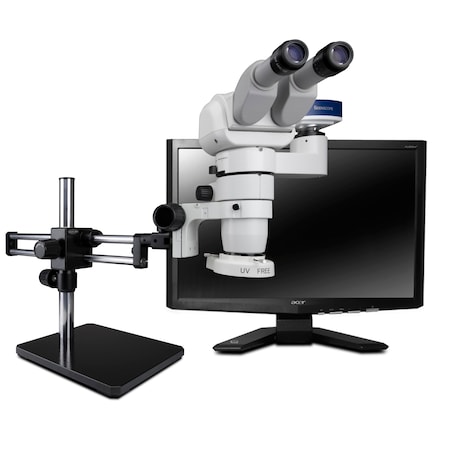 7X-45X Simul-Focal Trinocular Single-Arm Boom Stereo Microscope, 144-LED Light, 5MP USB 3 Camera