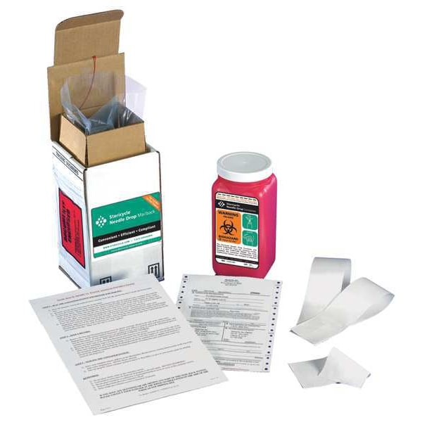 Sharps Mailback System, 0.25 gal Capacity, Red, White, Lid Type Screw Top, Material Plastic, Includes Bar-Coded Waste Shipping Containers, Prepaid and Pre-Addressed Shipping Labels, Prepaid Disposal and Tracking Documents, Standards EPA, FDA, OSHA