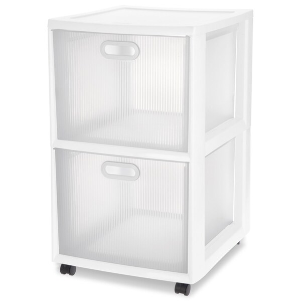 The Sterilite 2 Drawer Ultra cart accommodates letter sized hanging files to help bring order to your office or home work space. This practical and versatile storage solution features clear stylized textured drawer fronts with clear sides that allow items to be quickly identified. The attractive styling makes them an ideal organizing solution for any area around the home including living rooms bedrooms offices and more. Keep your files organized and easy to find when neatly hung in the Ultra Cart's deep drawers. Or use the drawers to keep paper craft supplies accessories and office / school supplies contained. Use the included casters to create a rolling storage option and easily move the Drawer Cart wherever it is needed.