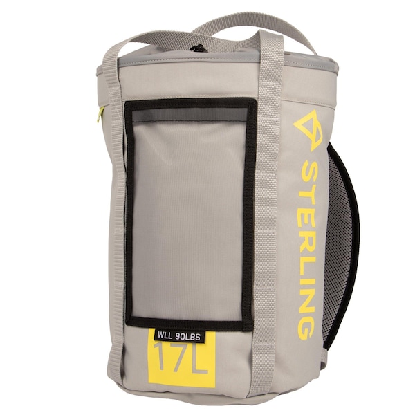 Sterling's sturdy rope bags are designed for rescuers, arborists and rope access professionals who need durability and reliability on the job. Made from abrasion-resistant and heavy-duty 900D recycled polyester, these bags have a free-standing design with an optimized height and width for easy packing and unpacking. Internal liner has a wide shroud to allow for folding over the bag to make it easier to load the bag. The internal liner is made of recycled Nylon. Each bag offers a WLL of 90 lbs. 40kg that is clearly marked on the outside of the bag. Each bag is Scannable enabled with an NFC chip in the shoulder strap to help with gear tracking, maintenance and inspection reporting. 2 Rope handles and 2 shoulder straps for easy carrying options. External daisy chains to carry more gear with internal rope tie-off to secure the working end. Grommeted drainage hole on the bottom of each bag. Whether youre hauling gear, or storing rope and equipment, these Sterling Carrier Rope Bags will get the job done efficiently and reliably. Carrier rope bags are a simple rope storage solution with 3 size options 17L, 31L and 45L to accommodate a wide range of rope sizes and lengths. Size: Small 17L storage capacity in Grey and Yellow color.