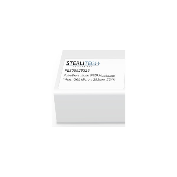 Sterlitech PES (polyethersulfone) membrane filters, 0.65 micron pore size, 293 mm diameter, pack of 25. Hydrophilic, low protein/drug binding, minimal extractables, and broad chemical tolerance; ideal for pharmaceutical, medical, and life science applications.