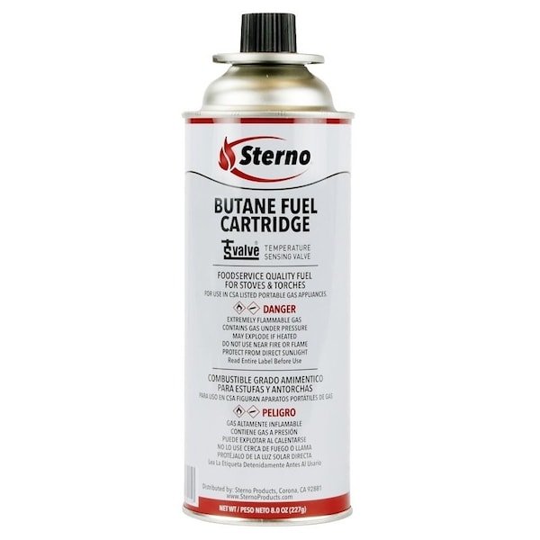 Sterno Butane Fuel Cartridge with TSV, Net Content: 8 oz, Can, Burn Time: 4 hr, Odor/Scent: Rotten Egg, Compositions: Butane, Isobutane, Propane, Boiling Point: -11 deg C, Density: 0.55 g/cc, Vapor Pressure: 3000 hPa