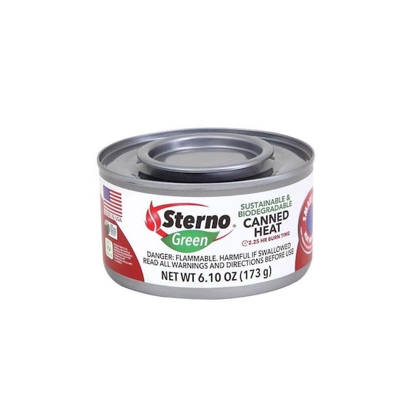 Our most popular canned heat. For over 100 years, the iconic Sterno Green Canned Heat has been the trusted source for food warming by home entertainers and catering professionals. Chafing fuel consumers want safety, performance and convenience. Sterno is the ultimate solution in safety, performance, convenience and value when preparing for catering events or large home entertaining events where food must be kept at an optimal serving temperature. Each can burns up to 2.25 hours. Sold as a 6 pack. Ideal for keeping cooked food HOT during dining occasions lasting over 1 hour such as Thanksgiving, reunions and parties. Integrated Smart Can Indicator alerts the user when the can is too hot to handle. Ideal for use in Sterno Wire Racks, Party Sets and Buffet Chafers.