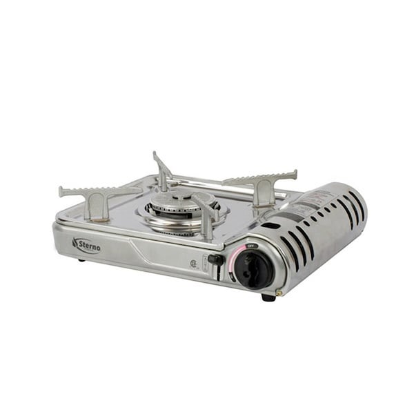 7,000 BTU Portable Butane Stove with Travel Case. Cook meals while on-the-go or camping! Designed for safety and convenience featuring a piezo electronic ignition with safety lock and automatic safety shut-off sensor. Use with Sterno Butane Fuel (sold separately). High Power 7,000 BTU heat output. CSA Listed. Weight: 4.7-lbs. Exclusive 5-Point Safety System. TSV/RVR Butane Cartridge, Rapid Release Mechanism, Additional Side-Venting, Removable Grate for Cleaning, Will Not Operate w/Grate Upside Down.