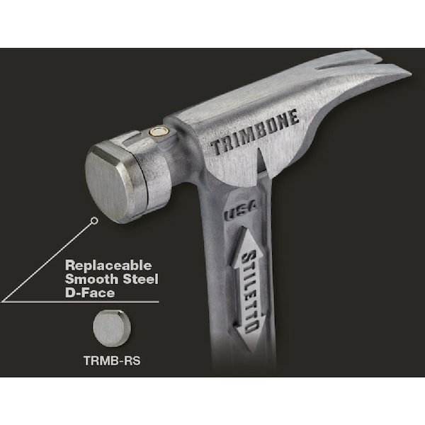 The STILETTO 10oz TRIMBONE Hammer with Smooth Steel Face and Curved Handle is designed for finish with specialized features. This All-Titanium hammer is 45% less weight and hits like steel. The compact D-Face and Trim Claw are ideal for tight spaces. The TRIMBONE also features a replaceable colored grip and steel face extending the life of the hammer and providing a personal touch. The 180 side nail puller is ideal for 2D-10D nails but has the power to pull up to 16D.